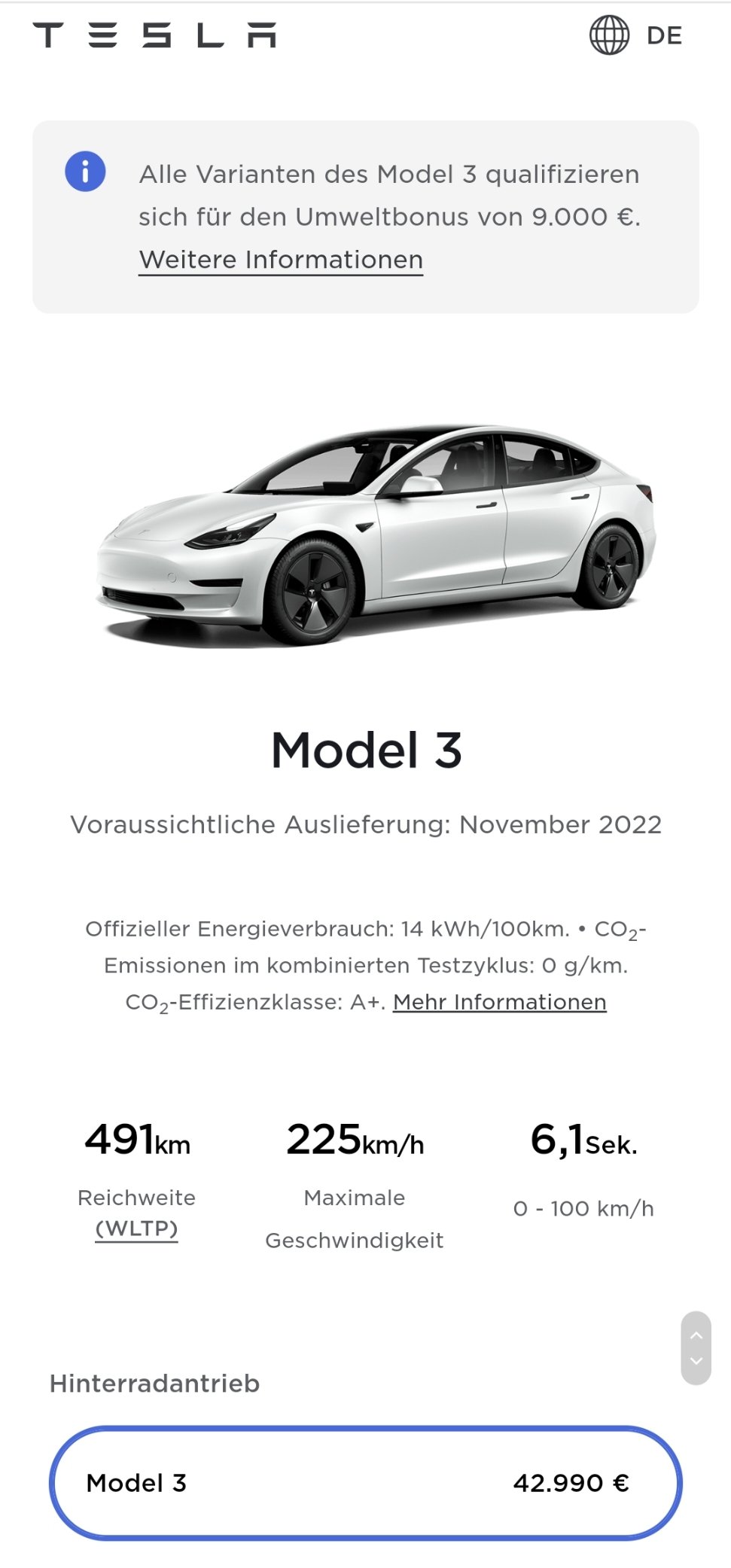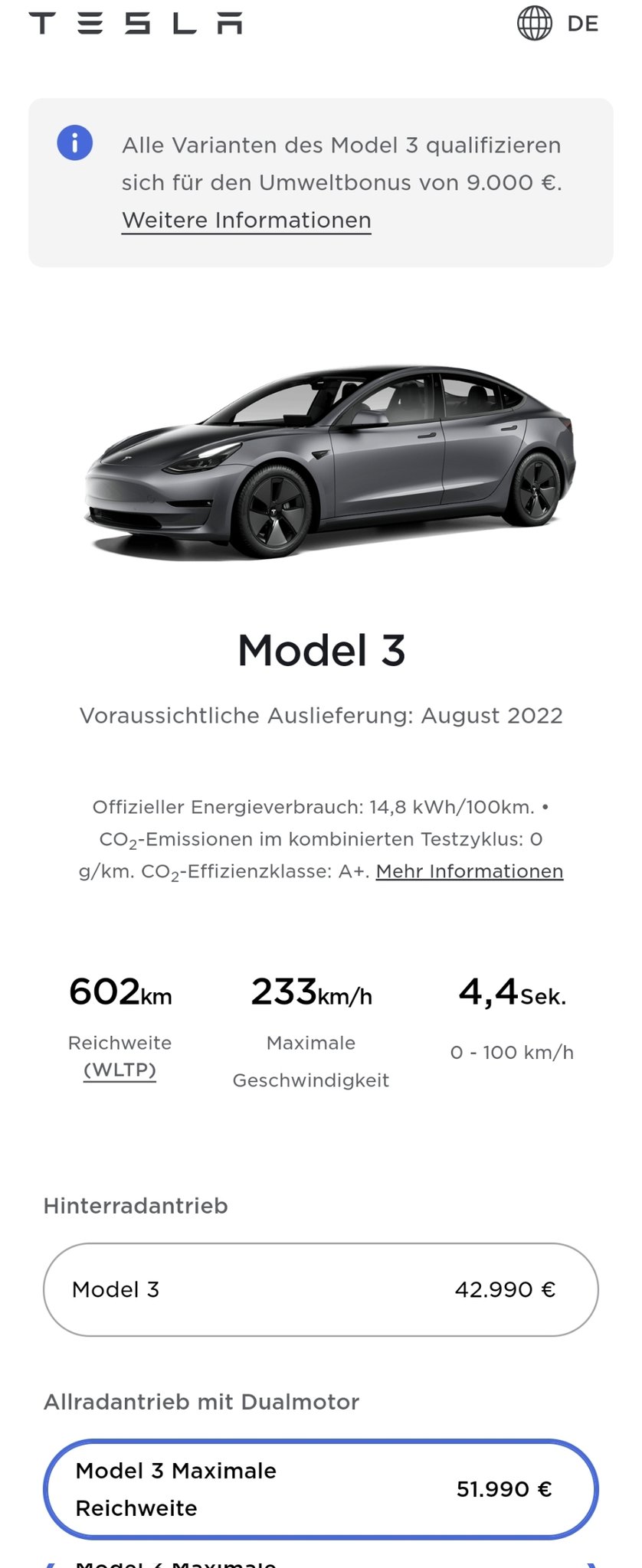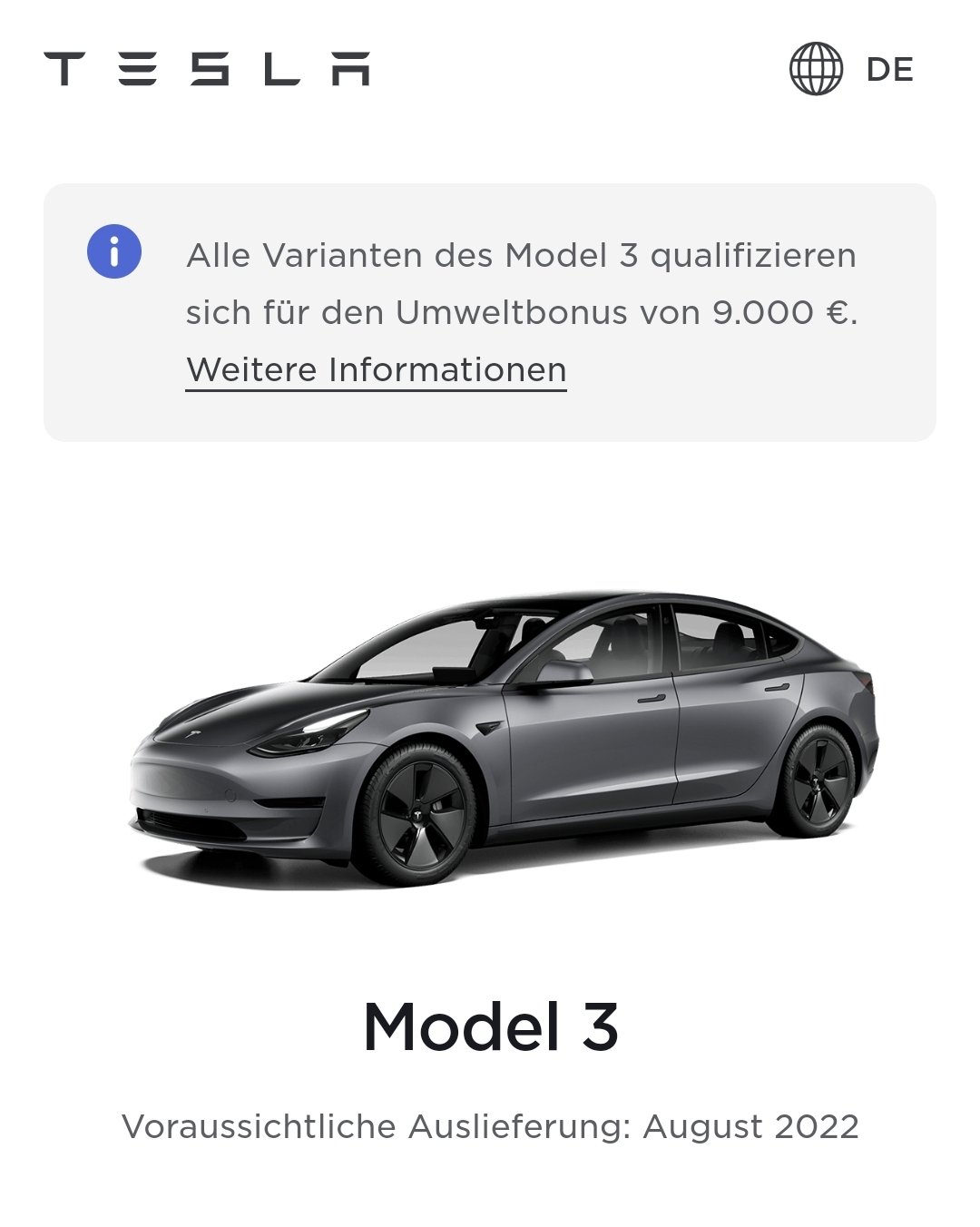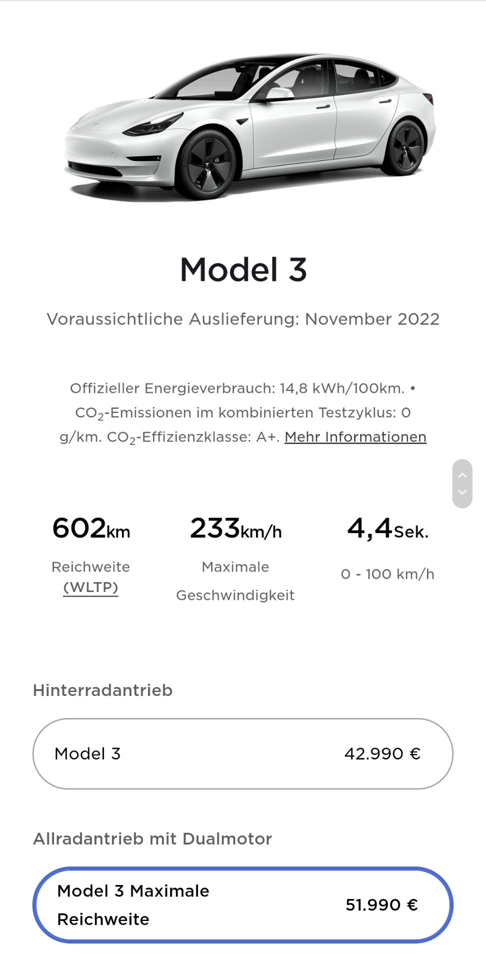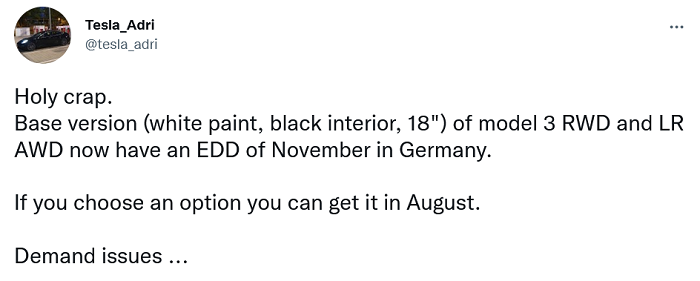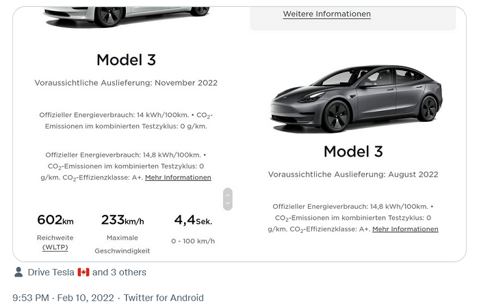 同样的情况也存在于白色Model 3 Long Range,其配备18''Aero轮毂。如果客户现在就订车,他们将最早于2022年11月收到车。对于那些可以额外支付19''运动轮毂的人,最近的交付日期跟Model 3 RWD相同,即8月。Model 3 Performance不论什么颜色都从5月开始收到。