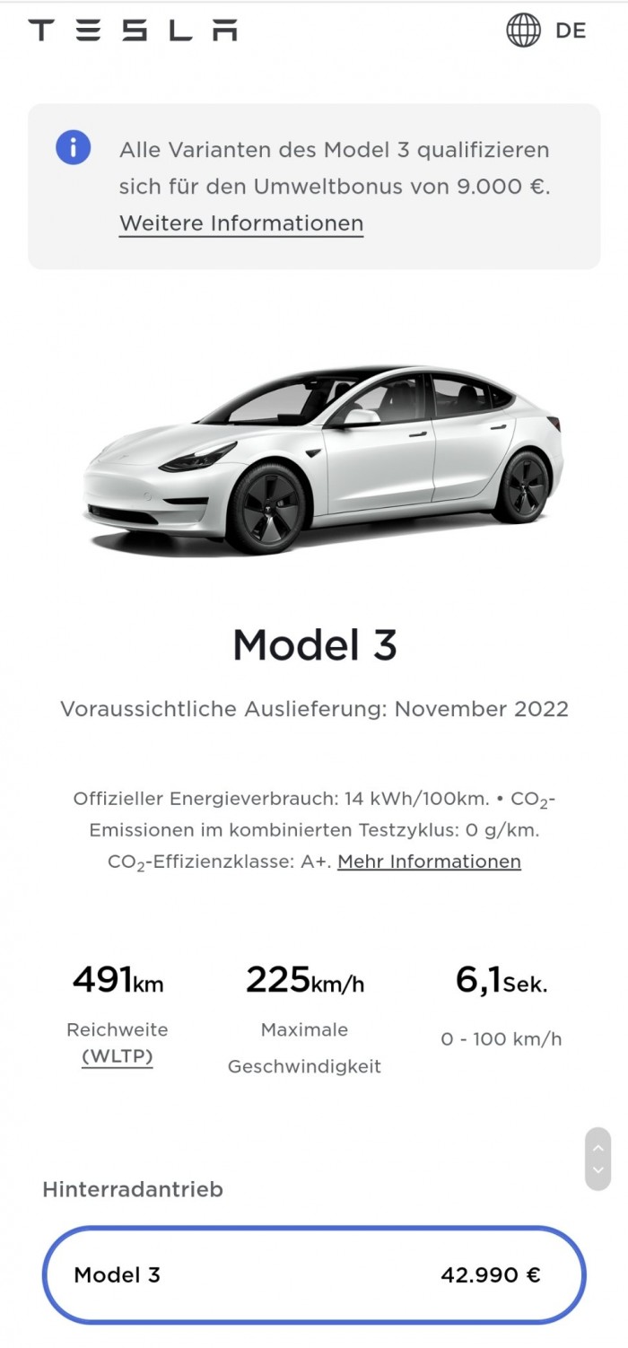 特斯拉Model 3在欧洲的基础车型已经在2022年的大部分时间里售罄。下一个交付日期现在则定在不早于11月的时间,这表明需求量大得惊人。2022年刚刚开始,欧洲人已经被迫等待九个月才能得到他们订购的后驱版(RWD)Model 3,包括珍珠白多色的基础版汽车,其配备18''Aero轮毂。