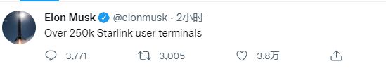 马斯克在推特上称:“星链用户终端超过25万个。”现在还不确定他的具体意思。但最有可能的是,马斯克是指这些终端正被使用中,但也有可能是指目前为止该公司制造的用户终端数量。