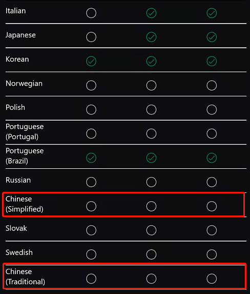 目前《 穿越火线 X 》支持 9 国语言, 简 / 繁中文均没有。虽然微软曾表示游戏会有中文,但为何没实装的原因也不明。。。