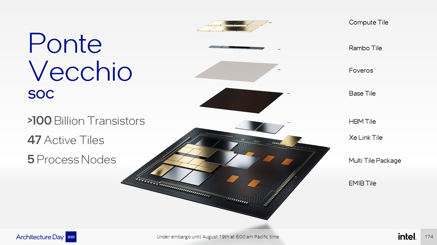 Ponte Vecchio将是Intel Xe HPC高性能计算架构的第一款产品,集成超过1000亿个晶体管,使用了5种不同工艺制程,内部集成多达47个单元模块(Tile),包括计算单元、Rambo缓存单元、Foveros封装单元、基础单元、HBM单元、Xe链路单元、EMIB单元,等等。