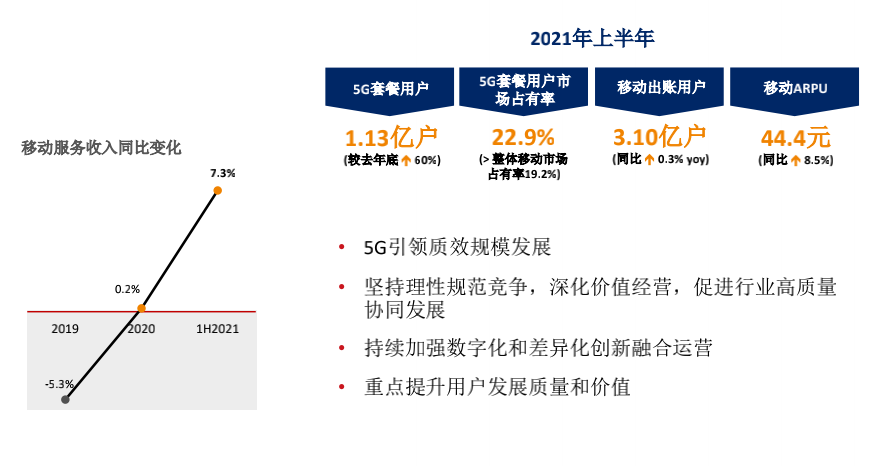 而在运营商密切关注的ARPU(每用户平均收入)方面,以2021年上半年数据来说,移动的移动用户ARPU是52.2元、联通是44.4元、电信为45.7元。ARPU越高,通常意味着运营商的营利能力越强。在增值服务受到严格监管、流量单价偏低的大环境下,提升ARPU最有效的方式,就是增加月租。