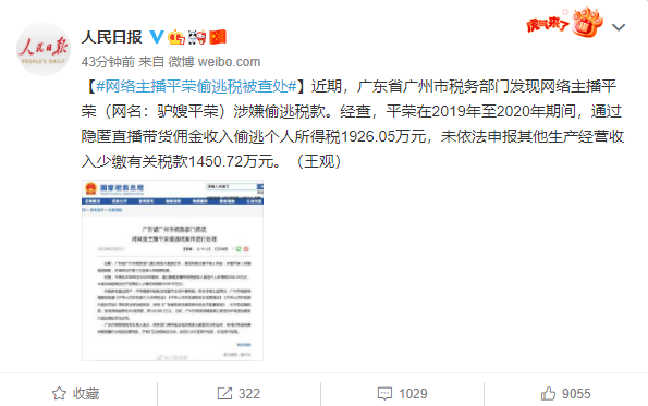 又一位主播因为偷税漏税被查了!2月22日,据@人民日报消息,主播平荣(网名:驴嫂平荣)涉嫌偷逃税款,被被罚款 6200.3万元。据了解,该主播在2019年至2020年期间,通过隐匿直播带货佣金收入偷逃个人所得税1926.05万元,未依法申报其他生产经营收入少缴有关税款1450.72万元。