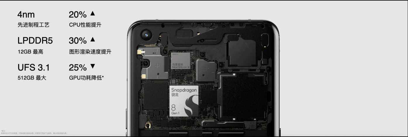 FindX5 Pro搭载全新一代骁龙8处理器,采用4nm制程工艺,CPU架构全面升级,性能提升20%,功耗降低30%,新一代AdrenoGPU核心面积增加60%,渲染速度提升30%,能效提升25%。