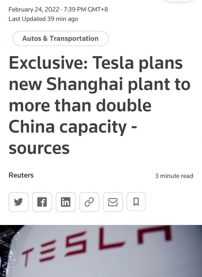 2月24日,有海外媒体爆料,特斯拉从3月份开始,将在上海建设第二家工厂。报道称,两名知情人士透露,特斯拉计划最早于下个月在上海开始建造一座新工厂,新工厂将位于其在浦东新区临港的现有生产基地附近,作为将中国产能翻一番以上以满足中国汽车和出口市场日益增长的需求计划的一部分,一旦新工厂全面运营,特斯拉将有能力每年生产多达200万辆汽车。