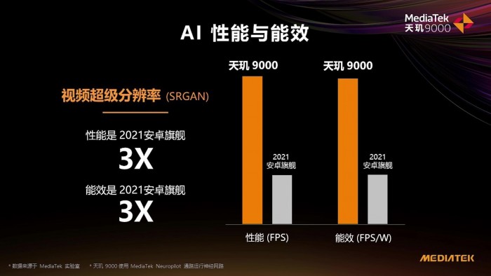 据了解,天玑9000集成了全新的第五代APU 590 AI单元,包括四个性能核、两个通用核,号称对比上代性能提升400%,能效提升400%,对比竞品则都高出300%。