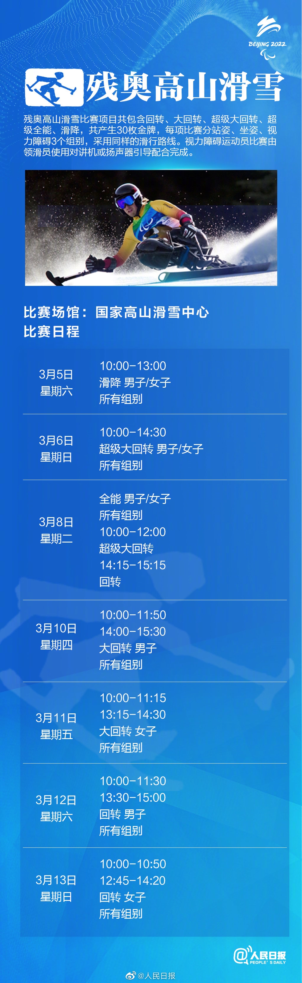 6个大项的比赛场馆、比赛时间分别是国家游泳中心/3月5-12日、国家体育馆/3月5-12日、国家高山滑雪中心/3月5-13日、云顶滑雪公园/3月6-12日、国家冬季两项中心/3月6-13日、国家冬季两项中心/3月5-11日.