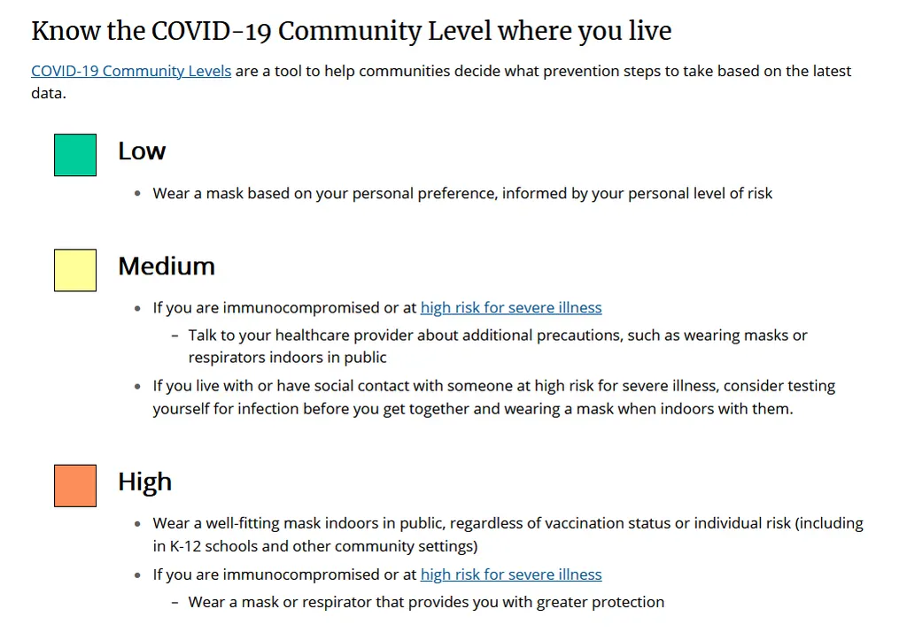 一个县是否被认为处于 COVID-19的“低、中、高”风险区域,主要衡量该社区有多少住院病人,有多少可用的床位等等。生活在低度或中度风险水平的县的人们不需要在室内戴口罩,但如果有人处于疾病的高风险状态,或者和高风险地区的人员接触,同样推荐他们佩戴口罩。同样的口罩指导也将适用于学校。
