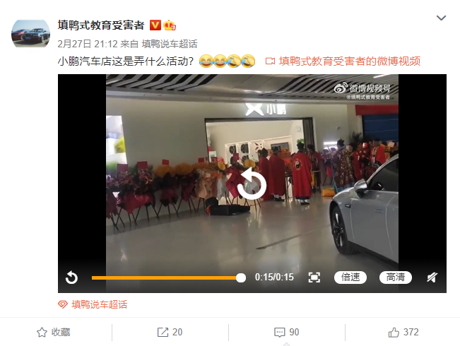 2月27日,知名汽车博主@填鸭式教育受害者 曝光了一则视频,引起了网友们的广泛关注。据拍摄的画面显示,某小鹏汽车门店迁址开业,然而请来“暖场”的竟然是一群身着道士服装的宗教界人士,而且疑似在现场“作法”,举办封建迷信活动。