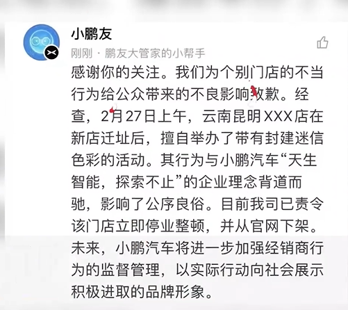 公告显示,2月27日上午,云南昆明某店迁址后,擅自举办了带有封建迷信色彩的活动,其行为与小鹏汽车“天生智能,探索不止”的企业理念背道而驰,影响了公序良俗,目前已责令该门店立即停业整顿,并从官网下架。