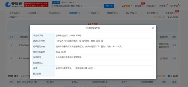 天眼查App显示,近日,北京新东方迅程网络科技股份有限公司因涉嫌利用虚假或使人误解的价格手段诱骗消费者交易,被北京市海淀区市场监督管理局罚款40万元。具体事由为,当事人委托一公司代理发布“新东方-1元雅思课”广告,称原价399元精品课只需1元。