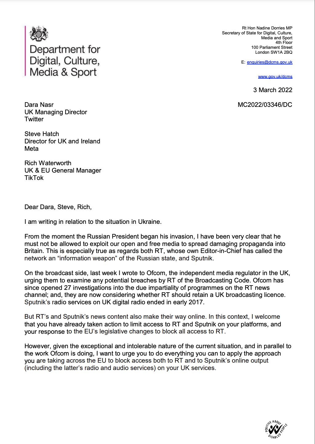 在英国政府的要求下,Facebook和Instagram对英国的用户封锁了RT和Sputnik。此前,文化大臣纳丁·多丽丝在一封信中敦促Meta、TikTok和Twitter限制对俄罗斯国有媒体的访问,她指责这些组织向英国传播"破坏性宣传"。