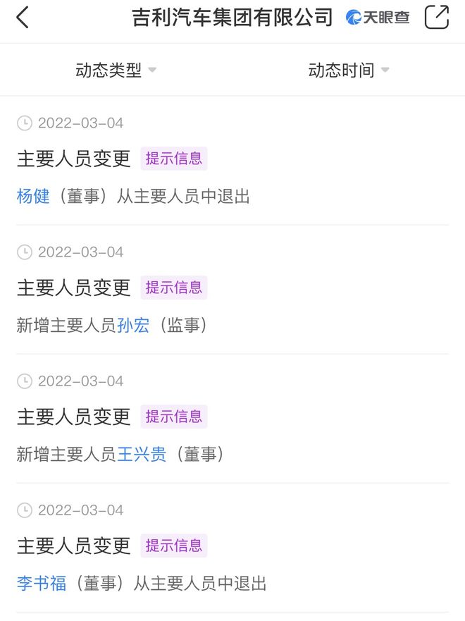 2月24日,天眼查显示浙江吉利汽车有限公司发生多项工商变更,李书福退出董事职位;公司法定代表人由安聪慧变更为淦家阅;原股东浙江吉利控股集团有限公司退出,新增股东吉利汽车集团有限公司。