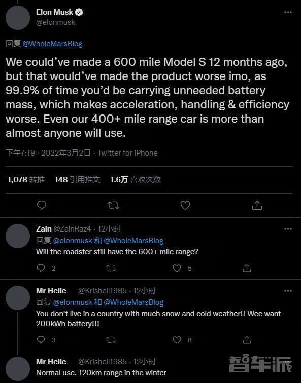 3月3日,马斯克在推特上发表的一番关于“过高的电动汽车续航没有意义”的言论在网上引起热议。马斯克发推特称:“我们本可以在12个月前制造出600英里(约966公里)的Model S,但这会使产品变得更糟,因为99.9%的时间你会携带不需要的电池,这会使加速、操控和效率变得更糟。”