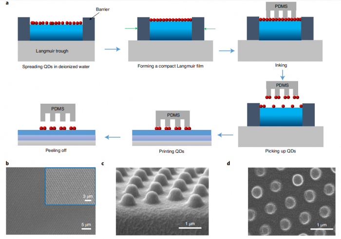 在该研究中,研究人员利用有序分子自组装技术实现了致密无缺陷的量子点单层膜,并结合转移印刷技术实现了亚微米级像素的超高分辨率量子点显示,其最高分辨率达到~25000PPI(人眼极限分辨率约为300PPI),实现了量子点图案化薄膜的均匀拾取和释放,可以轻松制备出亚微米级像素的超高分辨率量子点发光二极管。这是目前报告的显示器件的最高像素密度之一。