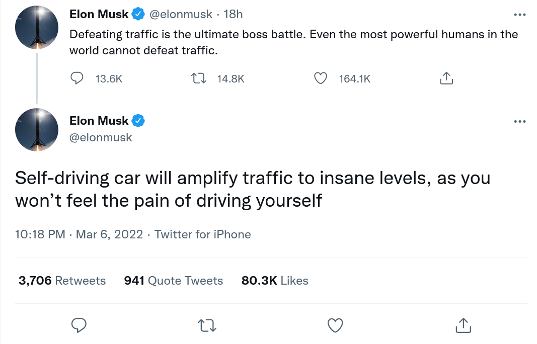 这位特斯拉CEO一开始重申了战胜交通是一项非常困难的任务的观点,称其为“最终的老板之战”。马斯克补充道,即使是世界上最强大的人类也无法战胜应对繁忙交通的苦差事。