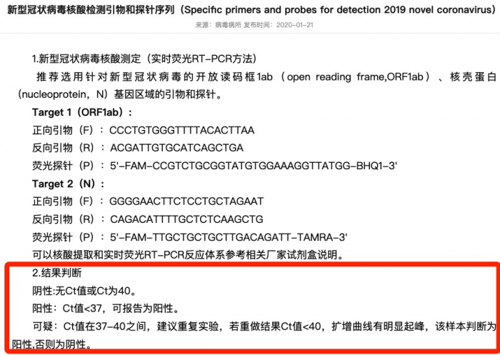 所以,根据中国疾病预防控制中心的数据。无 Ct 值或 Ct 值为 40,则为阴性。Ct 值<37,可报告为阳性。Ct 值在 37-40 之间,为可疑,建议重复实验。