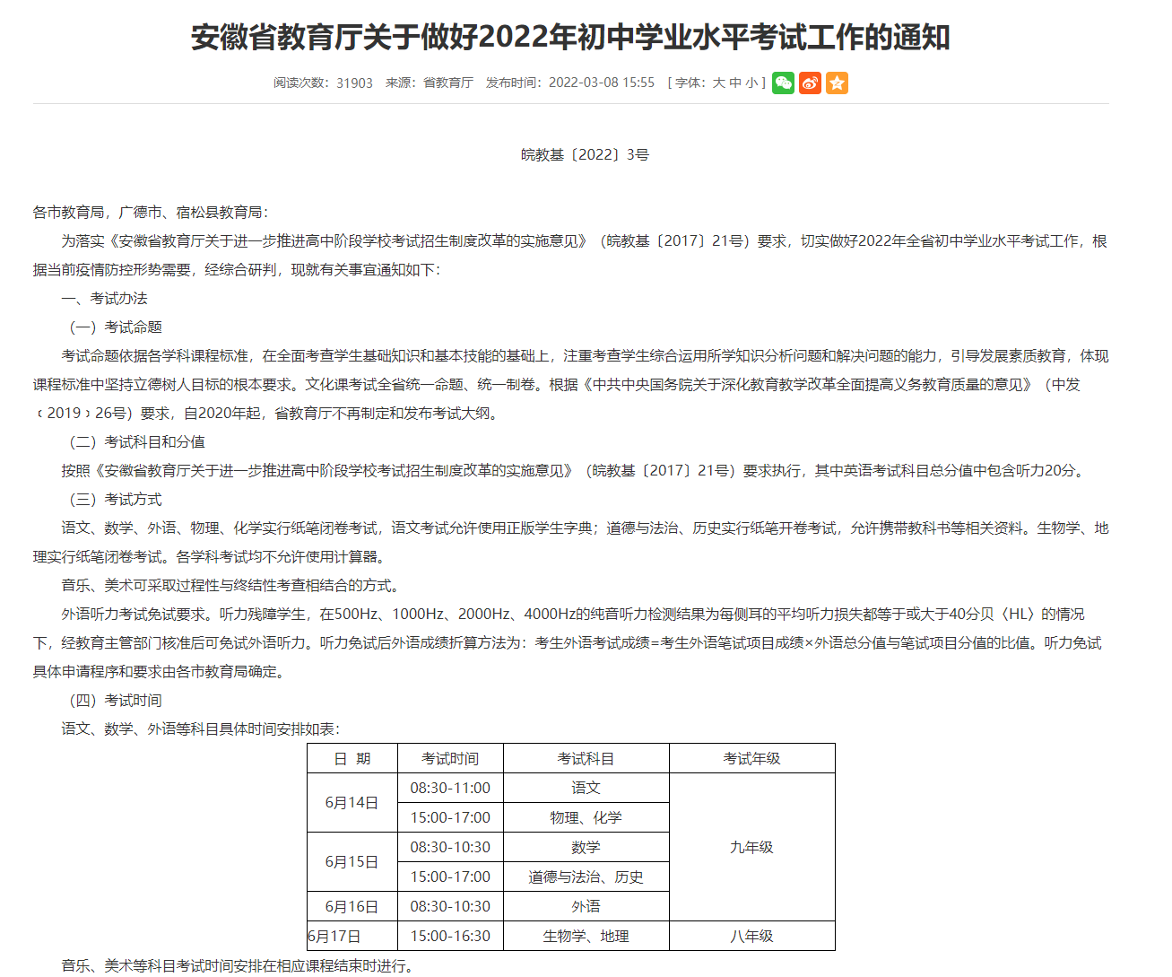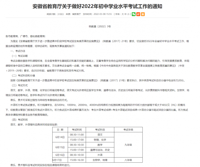 安徽省2022年中考时间为6月14-17日,其中14-16日九年级考试语文、物理、化学、数学、道德与法治、历史、外语,17日八年级考试生物、地理。