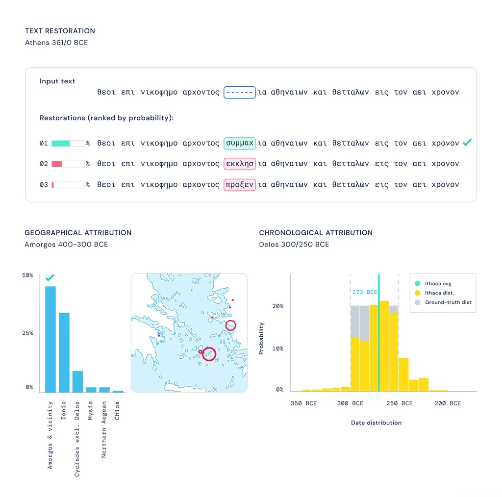 在《自然》杂志上发表的一篇描述 Ithaca 的论文中,创建该模型的科学家说,在修复受损文本中的字母时,它的准确率达到62%。它能以71%的准确率将碑文的地理起源归于古代世界的84个地区之一,并能将文本的日期确定在其已知写作年份的平均30年内。