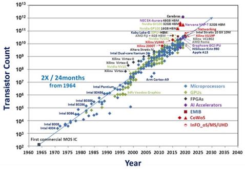 通过快速发展的片间互连技术和封装技术,摩尔定律从单独的晶体管缩放(摩尔定律1.0)演变为系统级缩放(被业界戏称为摩尔定律2.0)。