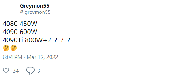 另一位曝料专家Greymon55怀疑,真正旗舰级的RTX 4090 Ti功耗可能会高达恐怖的800W甚至更高,即便是RTX 4080也会有450W,也就是目前RTX 3090 Ti的水平。