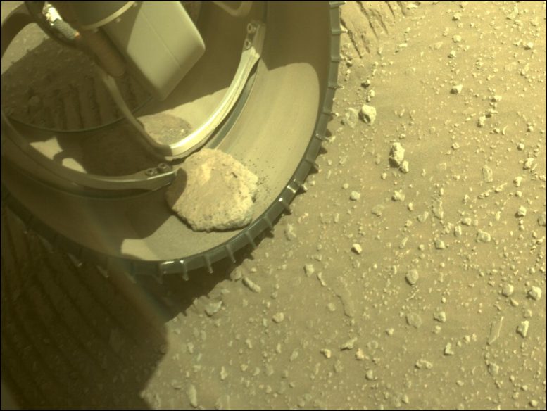 美国宇航局(NASA)的“毅力号”探测器日前遭遇了一个不受欢迎的“乘客”,一块石头卡在它的一个车轮里。这块石头的图片最近被选为“毅力号”任务的“每周最佳图片”。本周最佳图片是由公众意见选出的。“毅力号”在2022年2月25日拍摄了这张图片。
