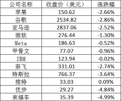 大型科技股普遍下跌,苹果、谷歌、亚马逊和奈飞跌幅均超过2%,微软跌幅超过1%。