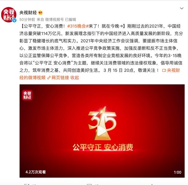 刚刚过去的2021年,中国经济总量突破114万亿元,新发展理念指引下的中国经济进入高质量发展的新阶段,充分彰显了稳健增长的底气和实力。2021年中央经济工作会议强调,要提振市场主体信心,激发市场主体活力,深入推进公平竞争政策实施,加强反垄断和反不正当竞争,以公正监管保障公平竞争,营造各类所有制企业竞相发展的良好环境。今年的3·15晚会将以“公平守正 安心消费”为主题,继续关注消费领域的违法侵权现象,倡导用诚信之力,筑牢消费之基,共同创造美好生活。