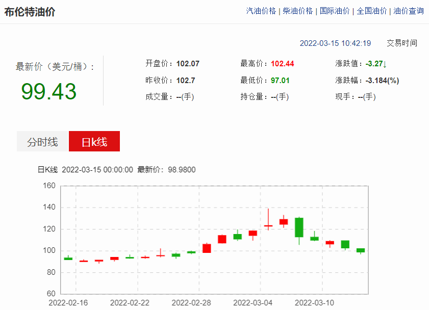 而好消息是,国际油价近期也呈现出下降的趋势,布伦特国国际油价,3月14日收盘价为102美元/桶,且前四个交易日,油价都呈大幅下降趋势,距3月8日129美元/桶的价格,已经大幅下跌。