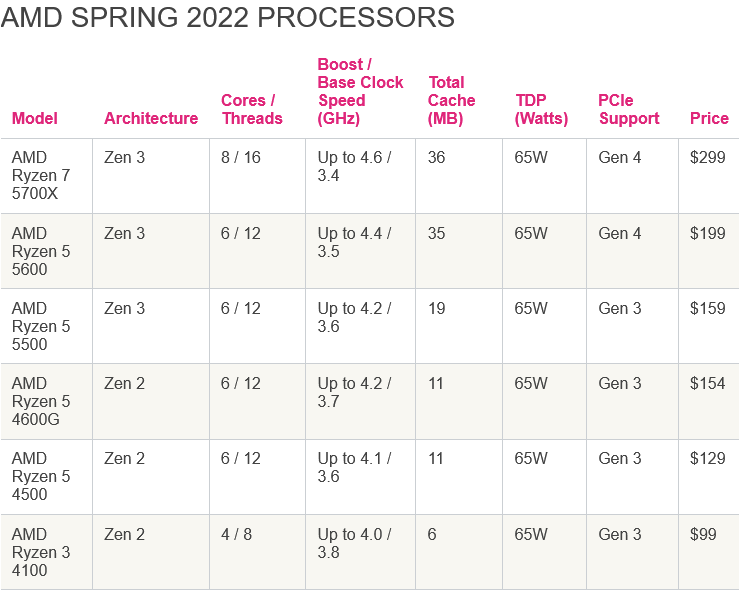 该公司还宣布了其他几款新的Zen 2和Zen 3台式机处理器,从299美元的Ryzen 7 5700X(提供8个内核、16个线程和4.6GHz的提升时钟速度)到该公司这一代产品系列中定位最低的99美元的Ryzen 3 4100。