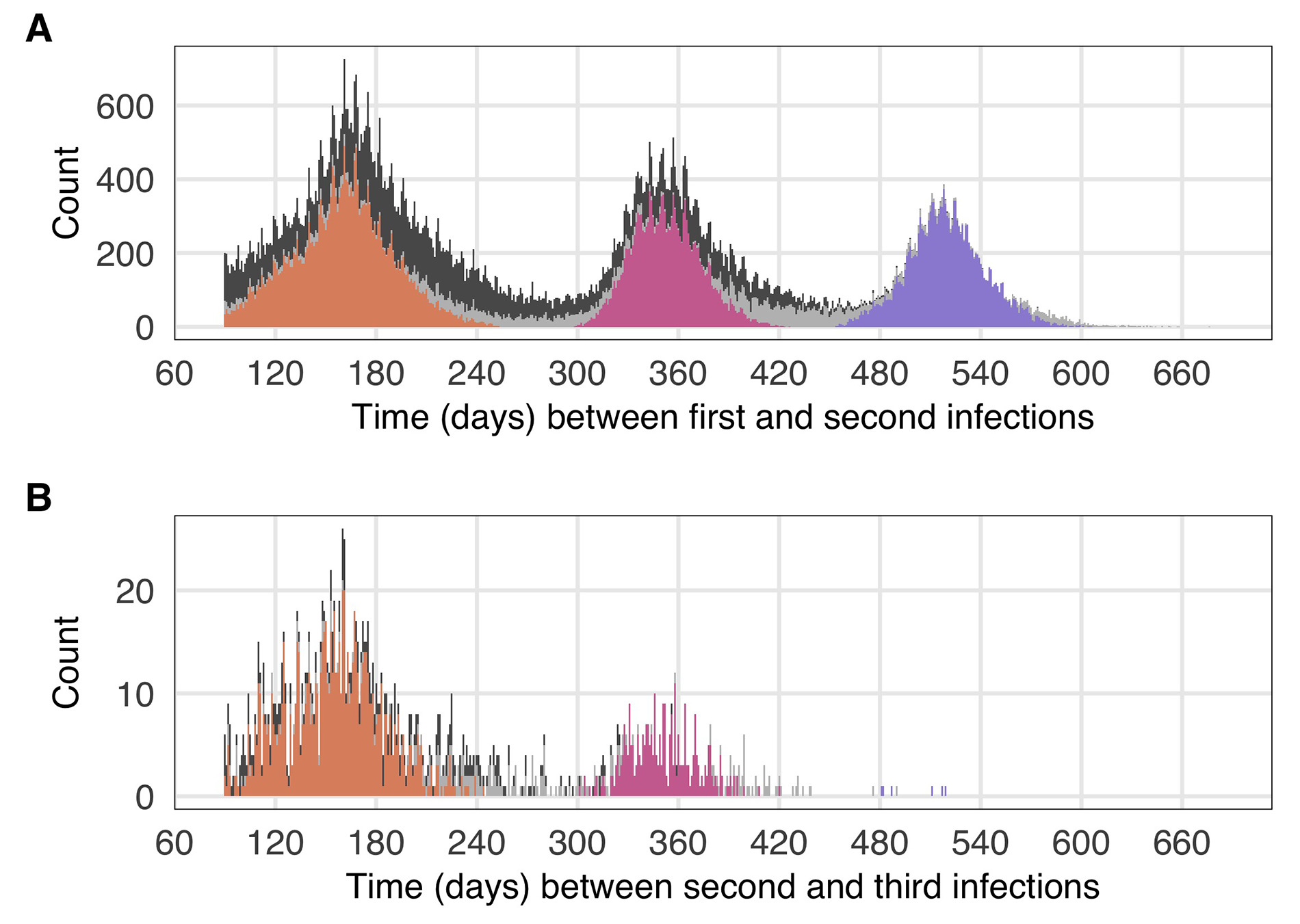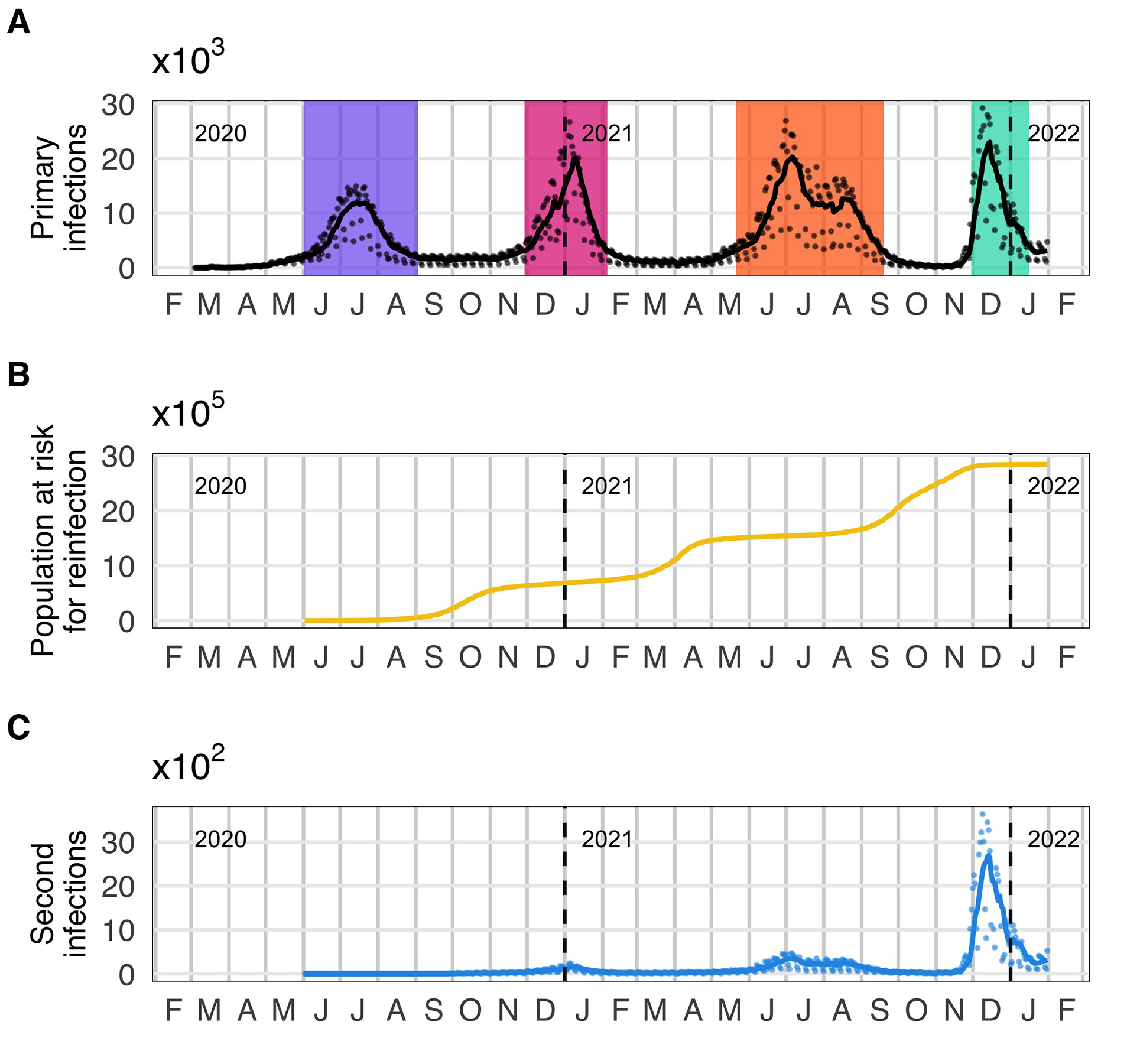 Pulliam等人使用一个模型来预测预期的再感染数量,发现Beta或Delta变种很少引起再感染。然而,作者观察到,在2021年11月初之后,即Omicron流通期,再感染的增加超过了预期。