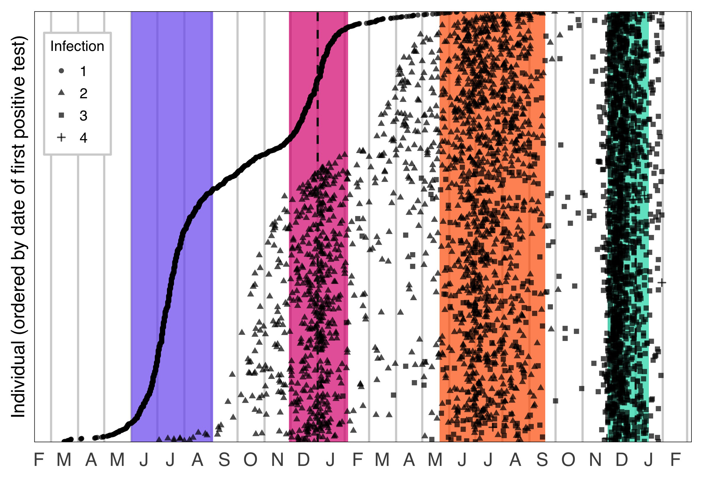 2021年11月初,南非科学家发现SARS-CoV-2的再感染与Omicron变种(B.1.1.529)出现的时间一致。为了解决这一变种以及其他令人担忧的变种的流通是否与再感染风险的增加有关,研究人员Juliet Pulliam的团队评估了一组被SARS-CoV-2广泛感染的人群。