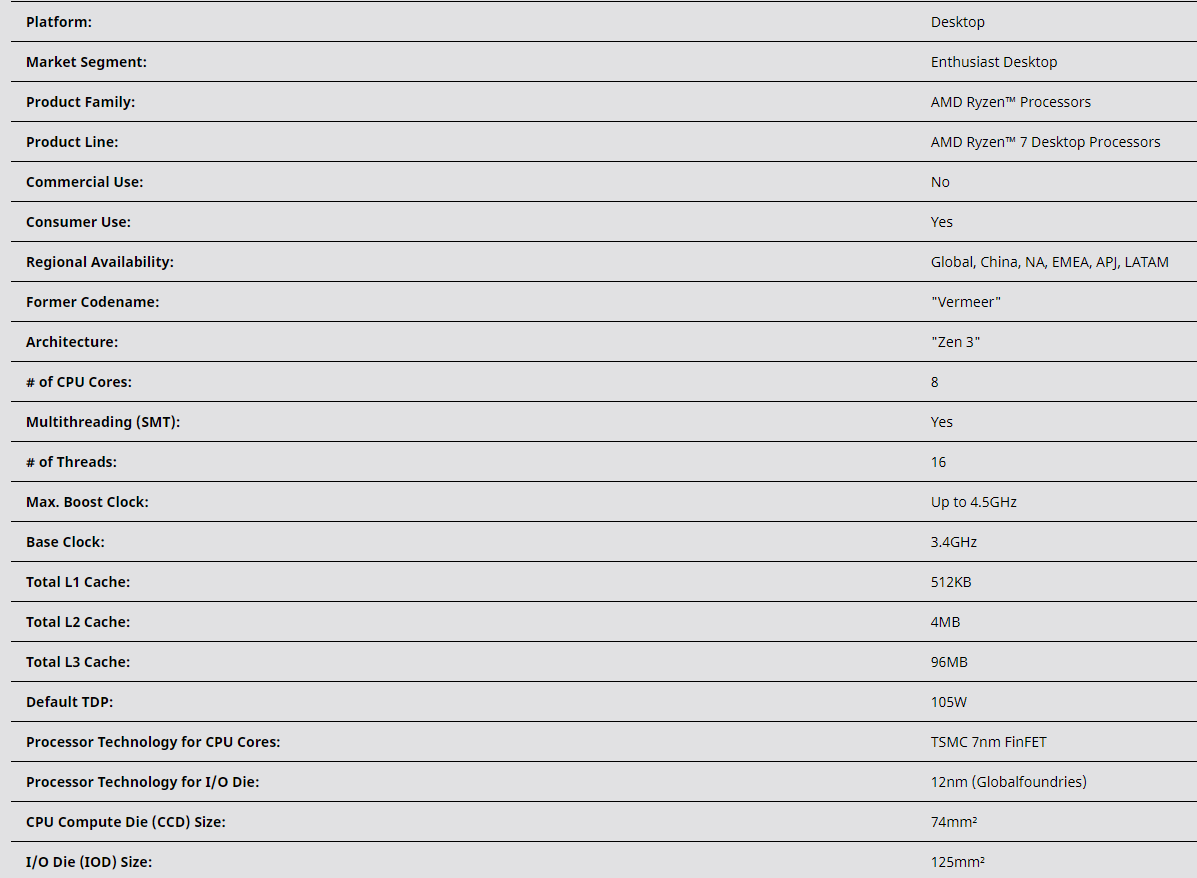 不过锐龙7 5800X3D增加缓存也不是没代价的,频率降低是已经知道的,基准频率从3.8GHz降低至3.4GHz,最高加速频率从4.7GHz降低至4.5GHz,从而维持热设计功耗维持在105W。