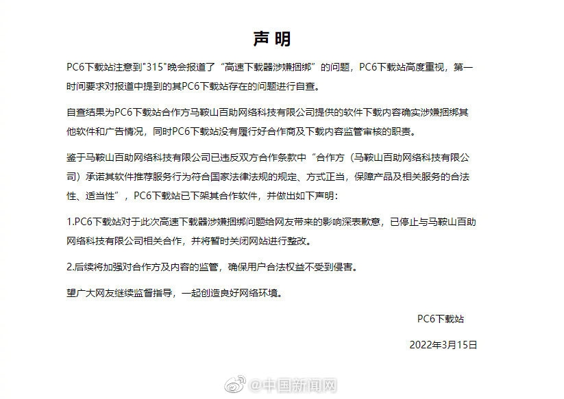据中新网报道,关于央视“3.15”晚会报道的下载平台高速下载暗藏捆绑软件安装陷阱的问题,PC6下载站回应称:“已停止与马鞍山百助网络科技有限公司合作,并暂关闭网站进行整改。”据悉,PC6网站已经无法浏览。
