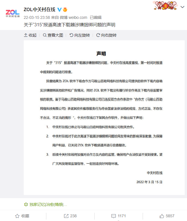 在此之前,关于央视“3.15”晚会报道的下载平台高速下载暗藏捆绑软件安装陷阱的问题,中关村在线微博发布声明进行了回应。