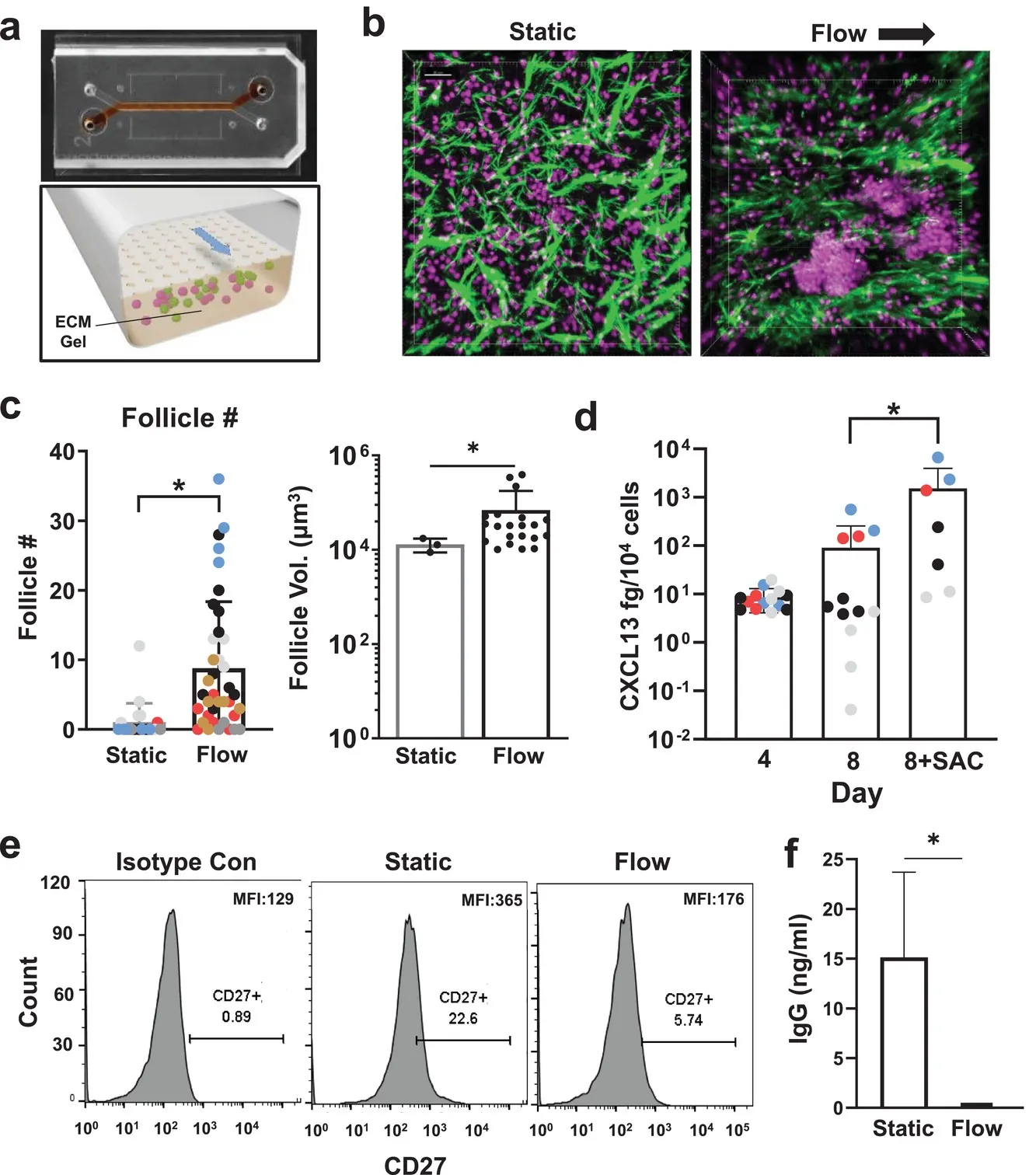 研究小组为这些微流控系统接种了 H5N1 流感菌株的疫苗,果然,接种疫苗的 LF 芯片产生的浆细胞和流感抗体远远多于那些在通常的平面细胞培养物中生长的细胞。当研究小组用市面上的流感疫苗重复实验时,也看到了类似的结果。发现几种细胞因子的水平与接受疫苗的人类相似。