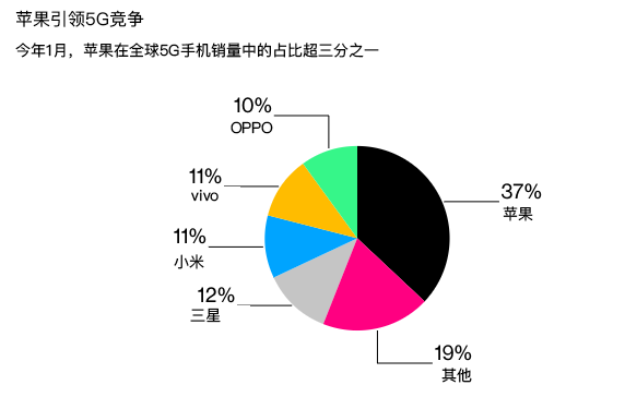 在5G手机销量中,苹果公司以37%的市场占有率遥遥领先,这也得益于iPhone在中国的热销。本月初,苹果推出了更便宜的5G手机iPhone SE,将入门价格降至429美元。尽管三星率先在2019年推出了兼容5G网络的手机,也依旧是全球最大智能机制造商,但是由于在中国市场已处于落后位置,其5G市场占有率被限制在12%。中国手机品牌小米、vivo以及OPPO的5G占有率分别为11%、11%、10%。