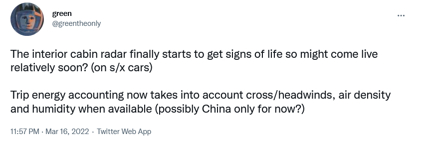 “Green”周三发布的推文称:“旅行能量计算现在考虑了侧风/逆风、空气密度和湿度(目前可能仅在中国?)”