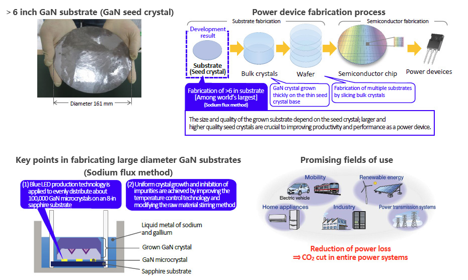 在一个由日本环境部领导的项目(利用GaN技术实现脱碳社会和生活方式的领先创新项目,包括验证基于GaN基材开发的应用产品的社会实施所带来的二氧化碳减排)中,丰田合成公司和大阪大学采用了一种在钠和镓的液态金属中生长氮化镓晶体的方法(钠通量法),制造了一个超过6英寸的高质量氮化镓衬底(氮化镓籽晶体),这是世界上最大的水平。他们接下来将为6英寸基板的大规模生产进行质量评估,并继续提高质量和增加直径大小(超过6英寸)。