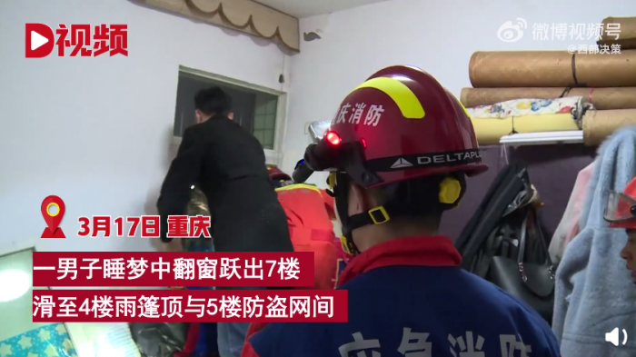 3月17日,重庆一男子睡梦中翻窗跃出7楼,踩着外墙防护网下滑至4楼雨篷顶与5楼防盗网间,男子清醒后情绪激动,踩踏响动惊醒邻居,邻居赶紧报警(视频)。消防到场见男子仅穿着秋衣裤,所处雨篷已塌陷,非常危险。