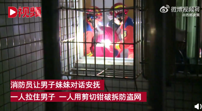 民警及男子家属告诉消防员,男子举动可能与精神疾病有关,消防员让男子妹妹对话安抚,抵达被困窗口后,一名消防员拉住男子左手,另一名消防员利用剪切钳对防盗网实施破拆,约3分钟后,防护网拆出供人进出的位置,男子顺利脱困。