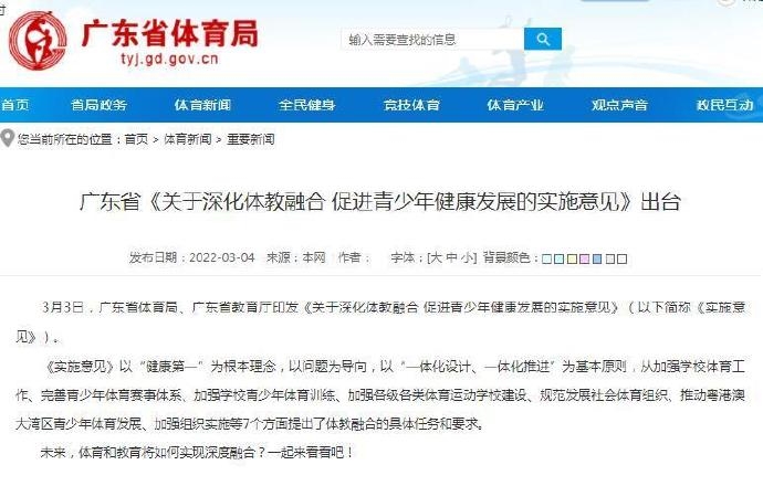 《意见》提出,坚持“健康第一”的教育理念,以“一体化设计、一体化推进”为基本原则,从加强学校体育工作、完善青少年体育赛事体系、加强学校青少年体育训练、加强各级各类体育运动学校建设、规范发展社会体育组织、推动粤港澳大湾区青少年体育发展、加强组织实施等7个方面提出了24条体教融合的具体任务和要求。