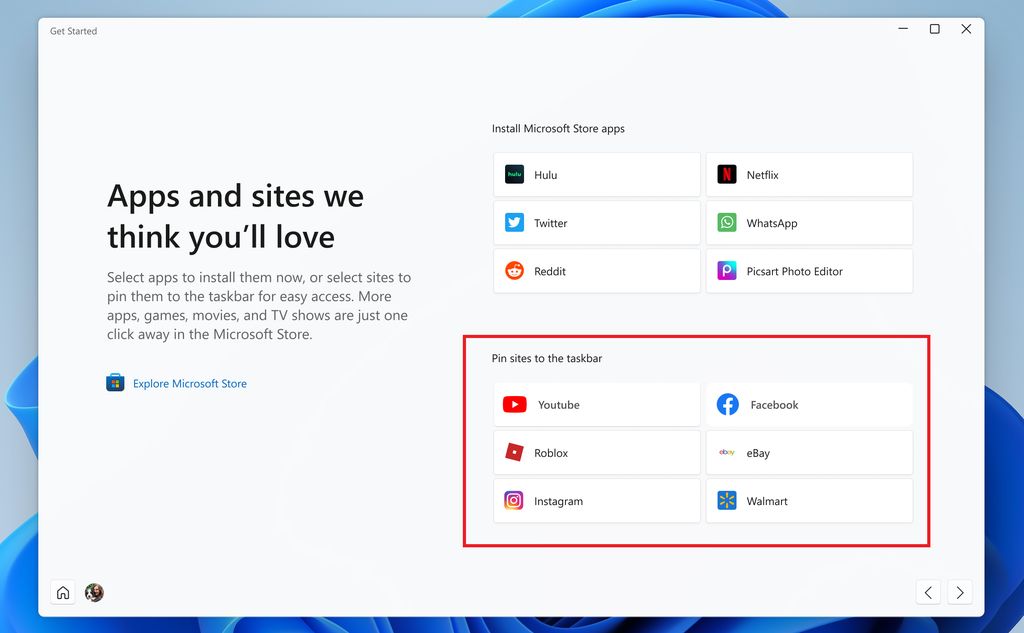 ● “Get Started”应用程序中添加了固定网站建议,这样你就可以方便地将网站固定在你的任务栏上。要找到这项新功能,请启动“Get Started”应用程序,并导航到“我们认为你会喜欢的应用程序和网站”页面。