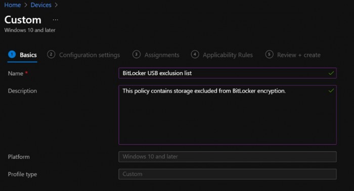 5. 在端点管理器门户中用这些日期创建一个配置文件,以设置你的BitLocker排除列表策略。