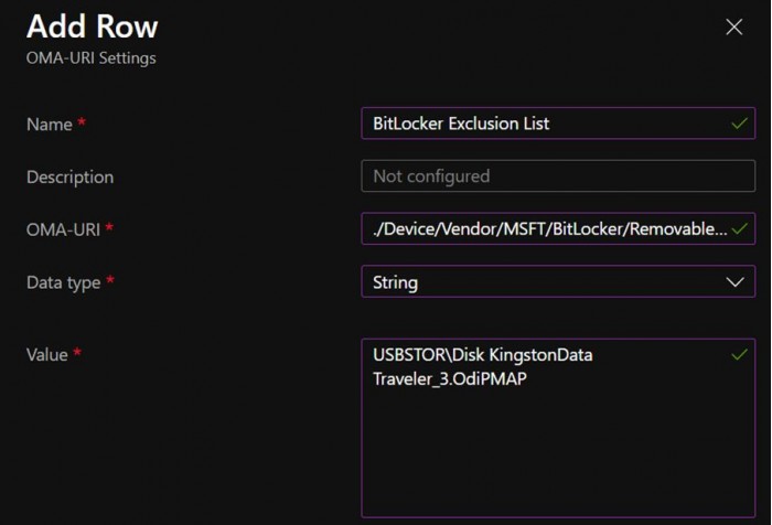 ● Oma-URI: ./Device/Vendor/MSFT/BitLocker/RemovableDrivesExcludedFromEncryption