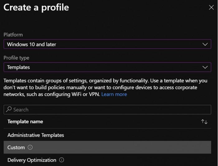 4. 选择平台"Windows 10及以后版本"和配置文件类型。"模板",然后选择模板名称。"自定义"。