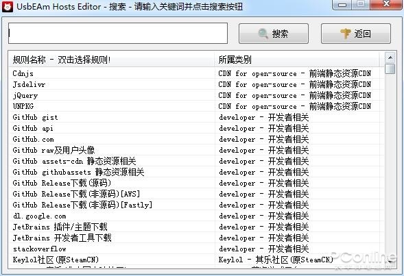 眼尖的朋友应该已经从上面的截图发现了,UsbEAm Hostss Editor并不仅仅支持Steam,还支持各种其他游戏平台,例如Epic、Origin等等。如果你发现这些游戏平台连接速度也不理想,也是完全可以使用UsbEAm Hostss Editor来解决问题的。而如果你点开“搜索Hostss”规则,还能发现更多网络服务例如GitHub等平台的加速方案,甚至还有具体到每个游戏的连接方案,可谓是满足各类玩家乃至网络用户的需求了。