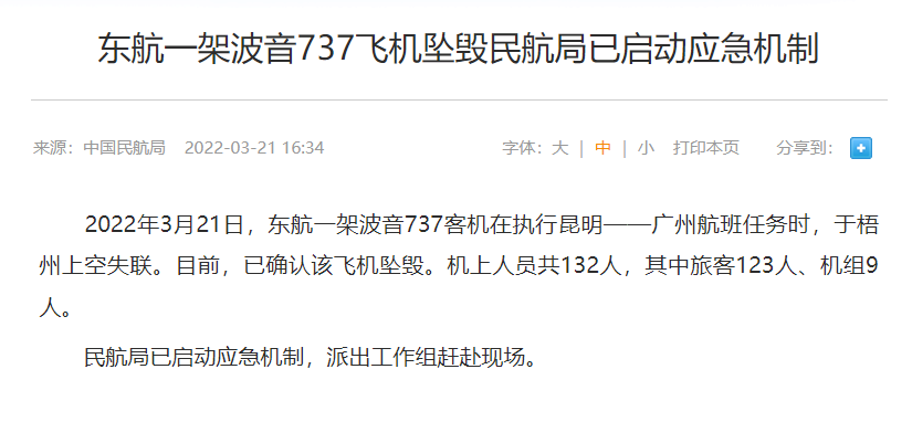 据中国民航局官网消息,2022年3月21日,东航一架波音737客机在执行昆明——广州航班任务时,于梧州上空失联。目前,已确认该飞机坠毁。机上人员共132人,其中旅客123人、机组9人。民航局已启动应急机制,派出工作组赶赴现场。