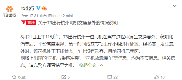 而T3出行官方也对此进行了回应:3月21日上午11时许,T3出行杭州一位司机在驾车过程中发生交通意外。
