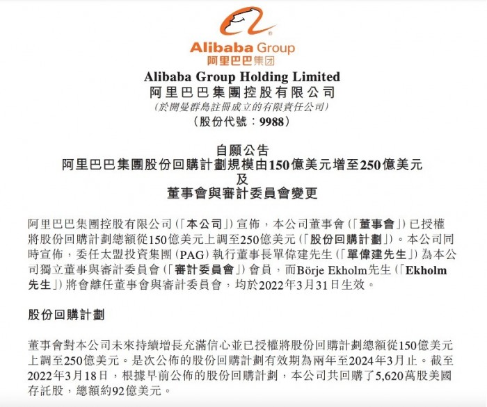 此外,阿里巴巴集团董事会宣布委任太盟投资集团执行董事长单伟建为董事会独立董事,将于2022年3月31日起生效,并将成为审计委员会成员。阿里巴巴集团宣布将股份回购计划由150亿美元扩大至250亿美元,创下中概股回购规模纪录。根据此前公布的股份回购计划,截至2022年3月18日,阿里巴巴集团共回购5620万份美国存托股(相当于约4.496亿股普通股),总额约92亿美元。